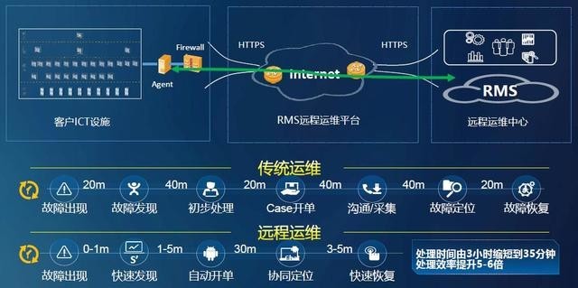 华为RMS远程运维服务基于部署在华为云上的RMS远程运维平台实现,远程有效实现了运维的全面监测和及时预警,故障快速分析、处理和恢复,充分体现了远程运维服务的特点和优势。华为通过RMS远程运维平台,为武汉雷神山医院提供了7x 24小时运维服务,有效保证了网络的稳定运行。